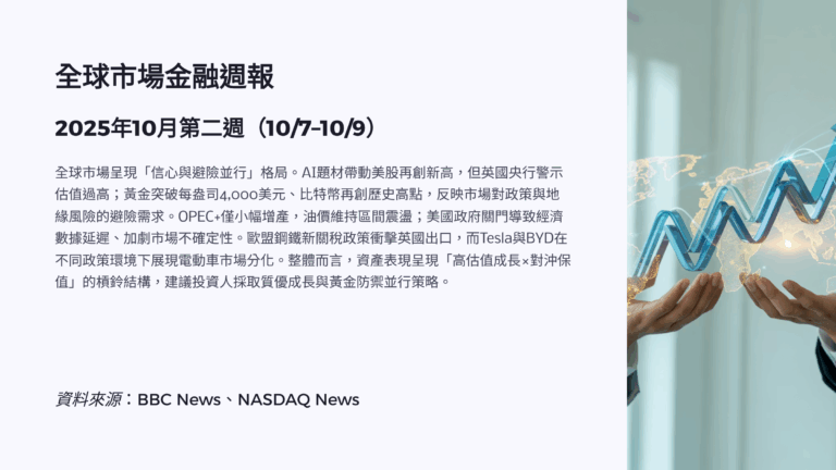 全球市場金融週報 2025年10月第二週(10/7–10/9) 全球市場呈現「信心與避險並行」格局。AI題材帶動美股再…