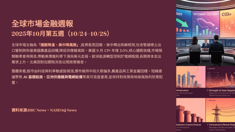 全球市場金融週報 2025年10月第五週(10/24–10/28) 全球市場主軸為「通膨降溫、美中降風險」,投資氣氛回…