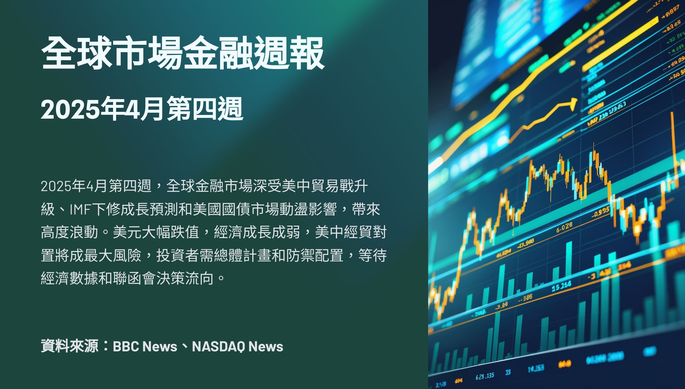 2025年4月第四週,全球金融市場深受美中貿易戰升級、IMF下修成長預測和美國國債市場動盪影響,帶來高度浪動。美元大幅跌值,經濟成長成弱,美中經貿對置將成最大風險,投資者需總體計畫和防禦配置,等待經濟數據和聯函會決策流向。