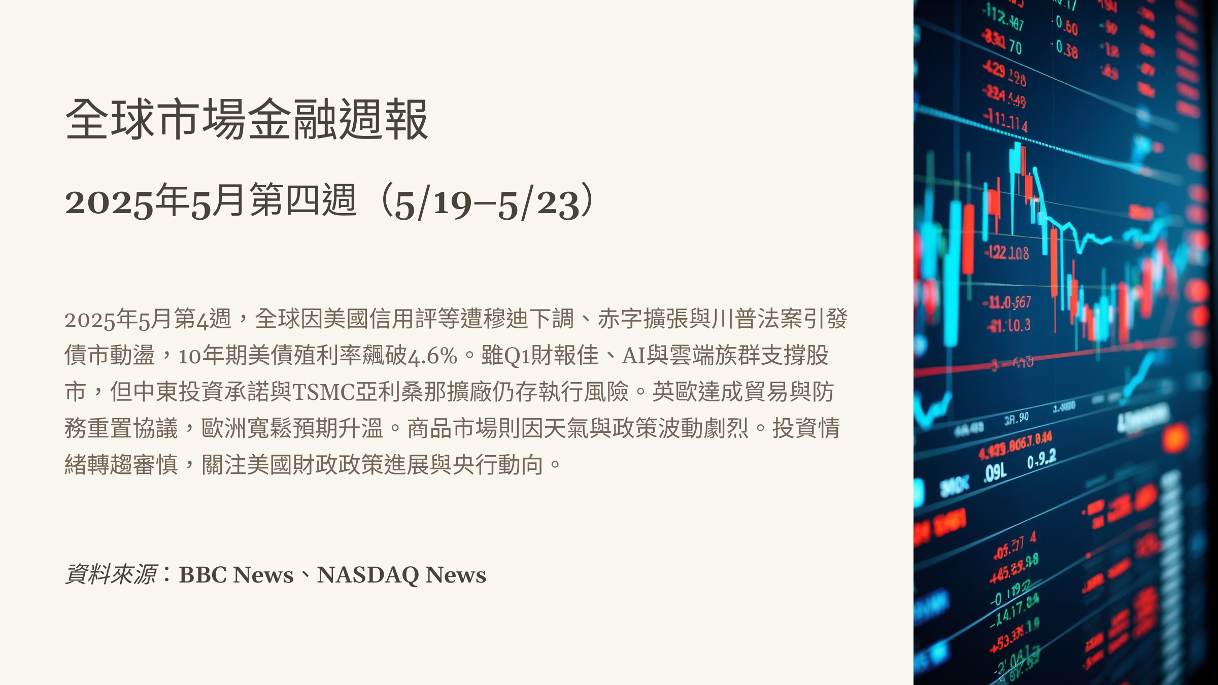 2025年5月第4週,全球市場因美國信用評等遭穆迪下調、赤字擴張與川普法案引發債市動盪,10年期美債殖利率飆破4.6%。雖Q1財報佳、AI與雲端族群支撐股市,但中東投資承諾與TSMC亞利桑那擴廠仍存執行風險。英歐達成貿易與防務重置協議,歐洲寬鬆預期升溫。商品市場則因天氣與政策波動劇烈。整體投資情緒轉趨審慎,關注美國財政政策進展與央行動向