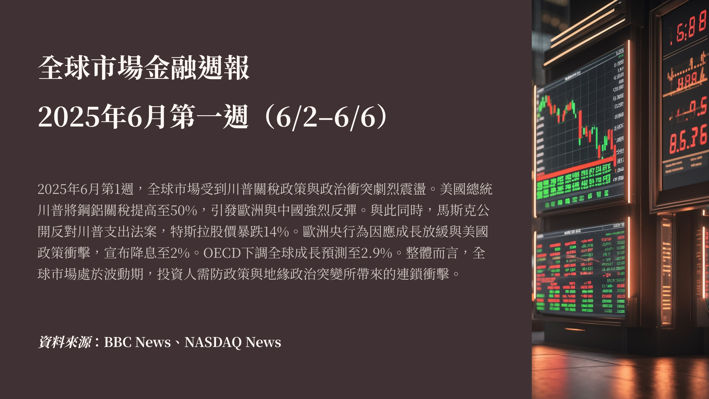 2025年6月第1週,全球市場受到川普關稅政策與政治衝突劇烈震盪。美國總統川普將鋼鋁關稅提高至50%,引發歐洲與中國強烈反彈。與此同時,馬斯克公開反對川普支出法案,特斯拉股價暴跌14%。歐洲央行為因應成長放緩與美國政策衝擊,宣布降息至2%。OECD下調全球成長預測至2.9%。整體而言,全球市場處於波動期,投資人需防政策與地緣政治突變所帶來的連鎖衝擊。