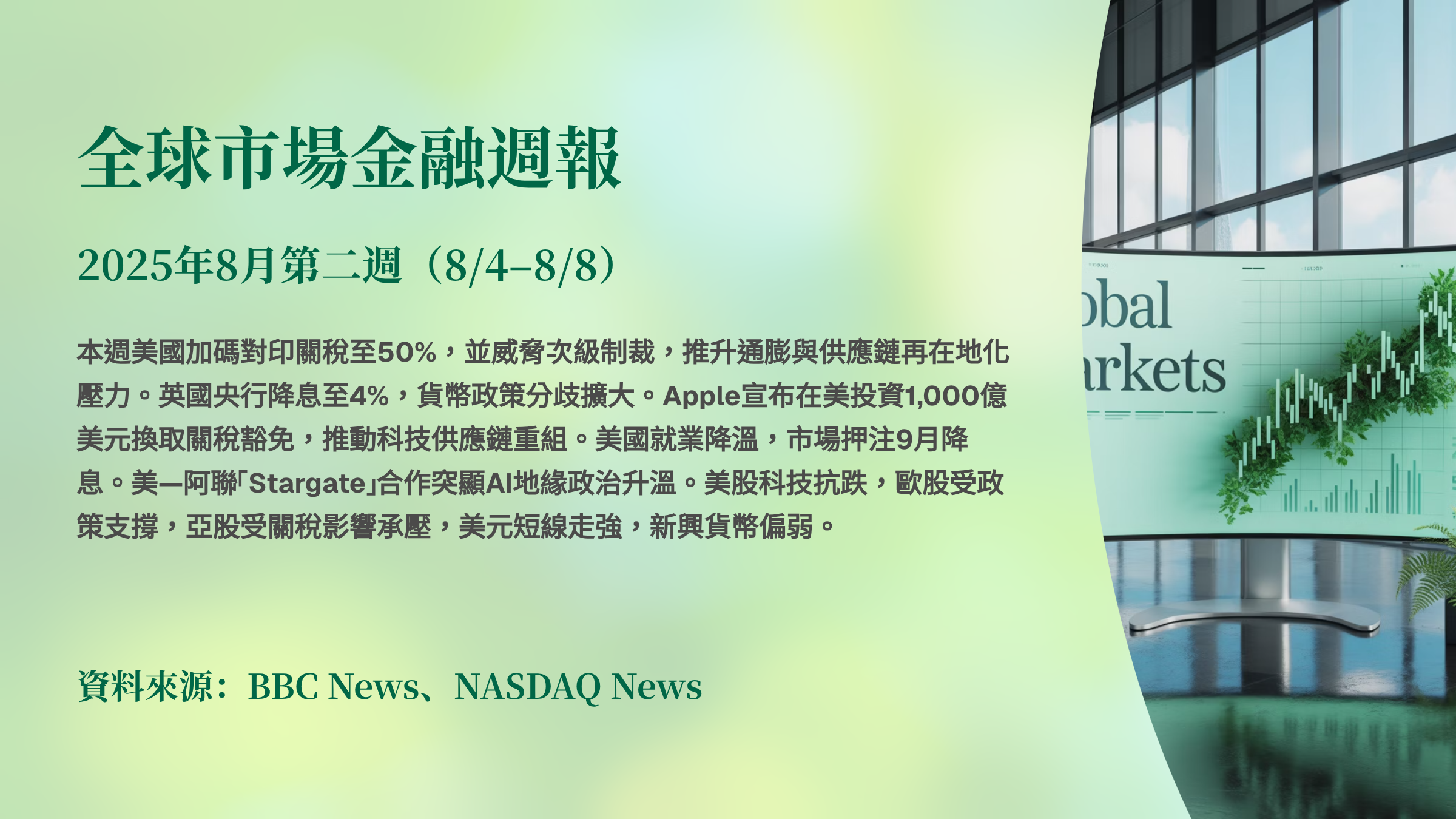 本週美國加碼對印關稅至50%,並威脅次級制裁,推升通膨與供應鏈再在地化壓力。英國央行降息至4%,貨幣政策分歧擴大。Apple宣布在美投資1,000億美元換取關稅豁免,推動科技供應鏈重組。美國就業降溫,市場押注9月降息。美—阿聯「Stargate」合作突顯AI地緣政治升溫。美股科技抗跌,歐股受政策支撐,亞股受關稅影響承壓,美元短線走強,新興貨幣偏弱。