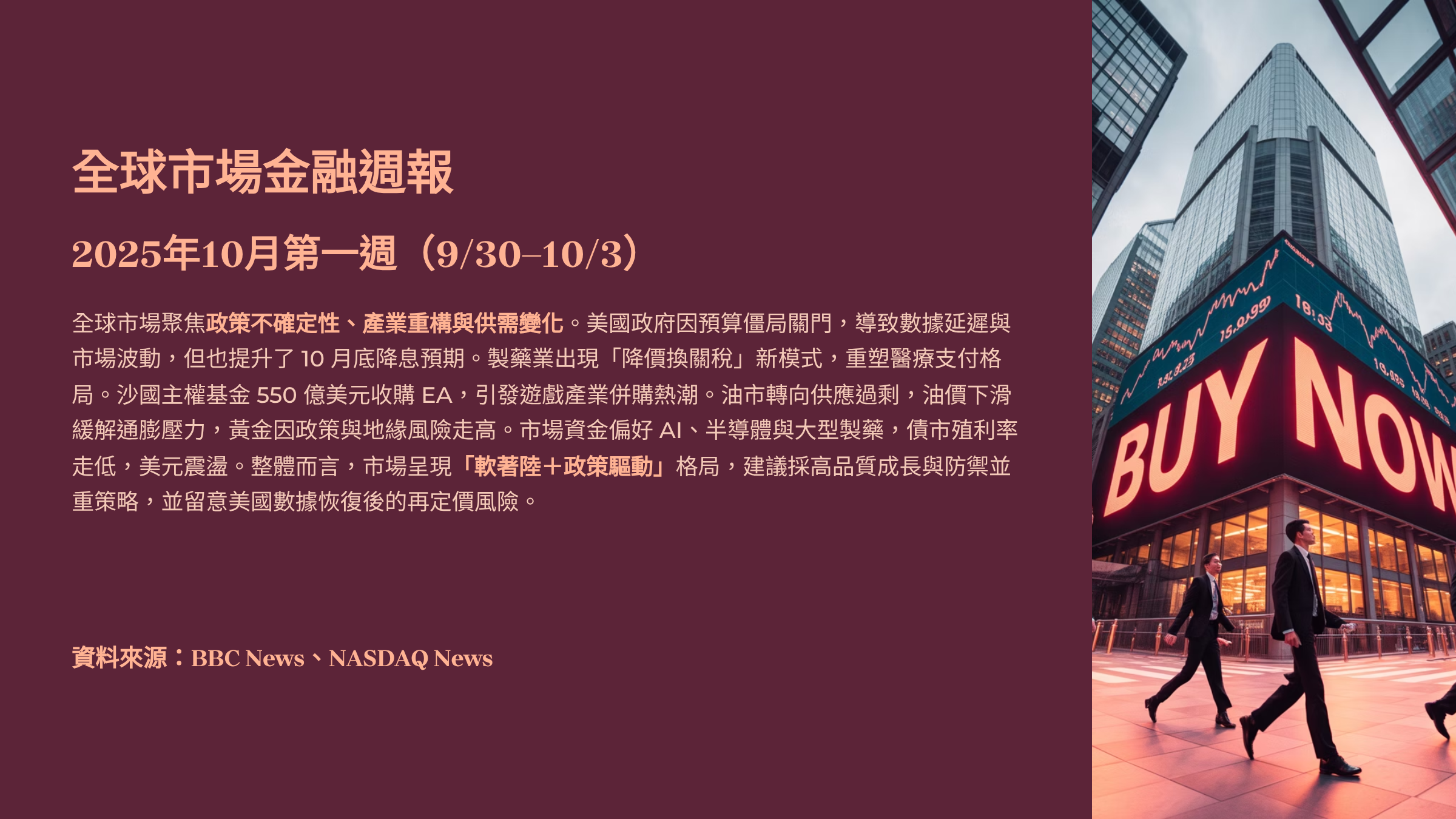全球市場聚焦政策不確定性、產業重構與供需變化。美國政府因預算僵局關門,導致數據延遲與市場波動,但也提升了 10 月底降息預期。製藥業出現「降價換關稅」新模式,重塑醫療支付格局。沙國主權基金 550 億美元收購 EA,引發遊戲產業併購熱潮。油市轉向供應過剩,油價下滑緩解通膨壓力,黃金因政策與地緣風險走高。市場資金偏好 AI、半導體與大型製藥,債市殖利率走低,美元震盪。整體而言,市場呈現「軟著陸+政策驅動」格局,建議採高品質成長與防禦並重策略,並留意美國數據恢復後的再定價風險。