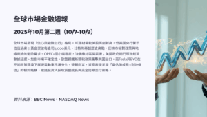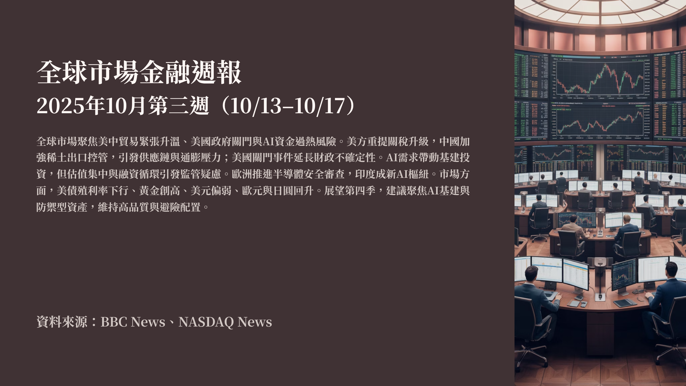 - 核心結論:本週市場在「政策製造的波動」與「政策導引的緩衝」之間擺盪——關稅與稀土管制提高成本與庫存需求,美國關門延長不確定性;相對地,Fed偏鴿、AI實體基建帶來現金流能見度。建議質優勝於貝塔、戰術性長存續期、貴金屬逢回。