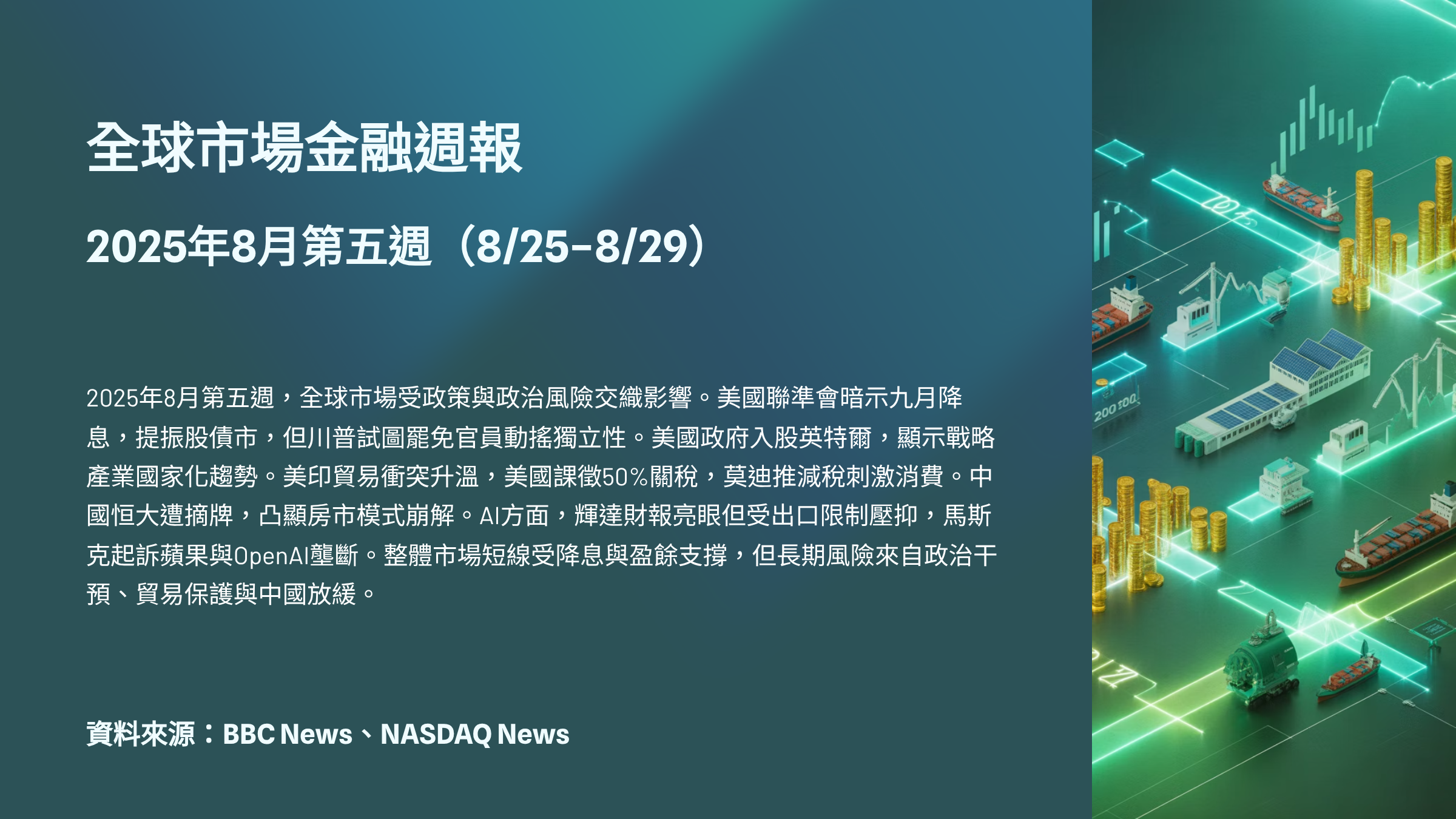 2025年8月第五週,全球市場受政策與政治風險交織影響。美國聯準會暗示九月降息,提振股債市,但川普試圖罷免官員動搖獨立性。美國政府入股英特爾,顯示戰略產業國家化趨勢。美印貿易衝突升溫,美國課徵50%關稅,莫迪推減稅刺激消費。中國恒大遭摘牌,凸顯房市模式崩解。AI方面,輝達財報亮眼但受出口限制壓抑,馬斯克起訴蘋果與OpenAI壟斷。整體市場短線受降息與盈餘支撐,但長期風險來自政治干預、貿易保護與中國放緩。