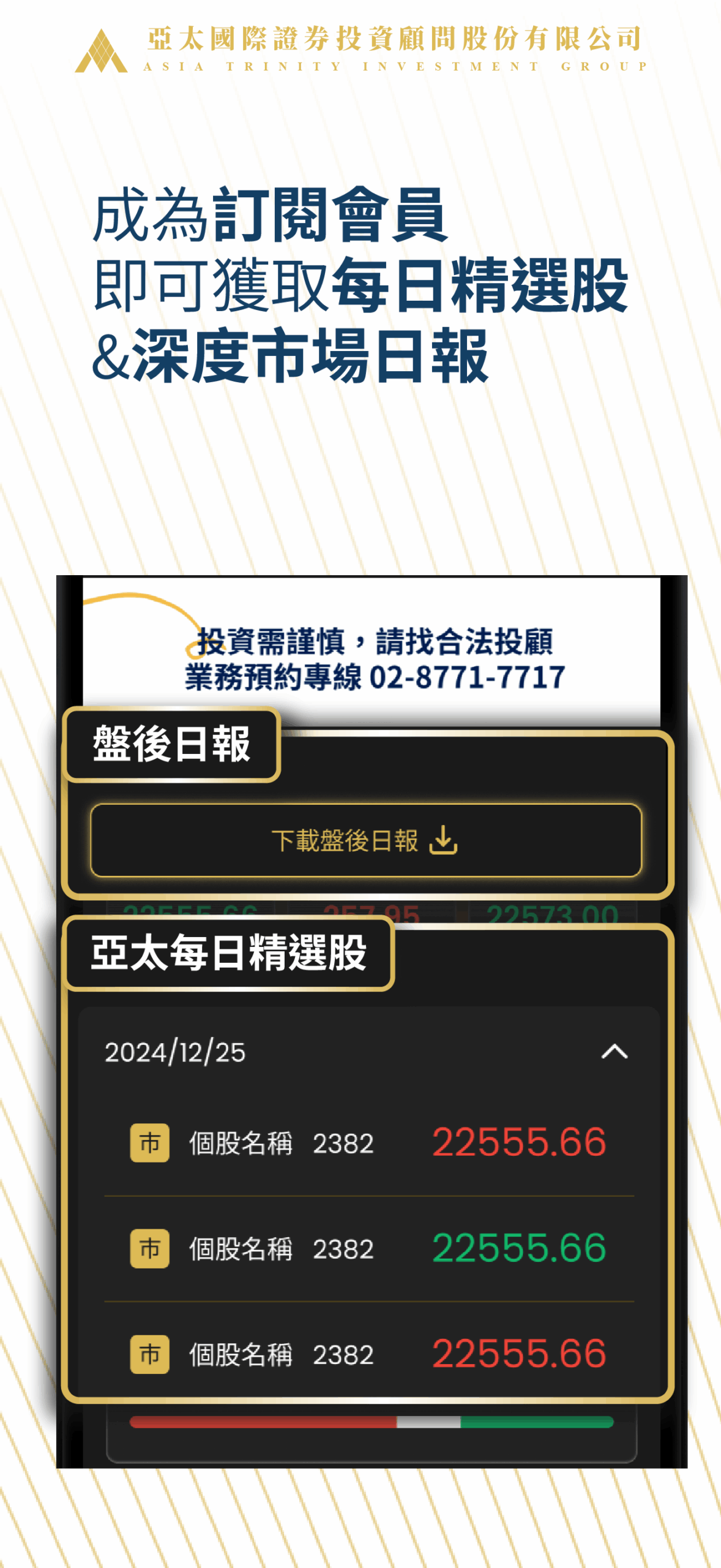 掌握專業顧問每日精選股與完整市場日報,實現財富成長的每一步!